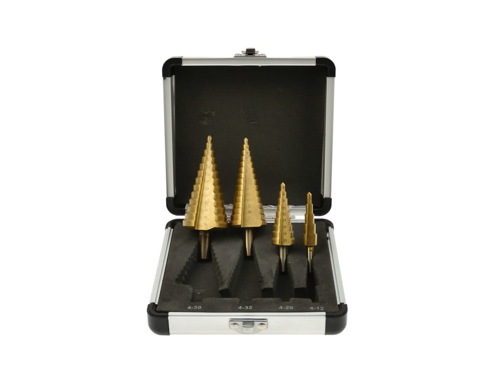 HSS TiN stupňový vrták, sada 4ks, 4-39mm, 4-32mm, 4-20mm, 4-12mm, ALU box Geko G38506