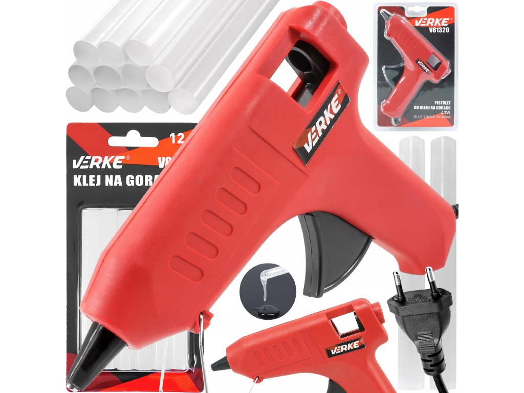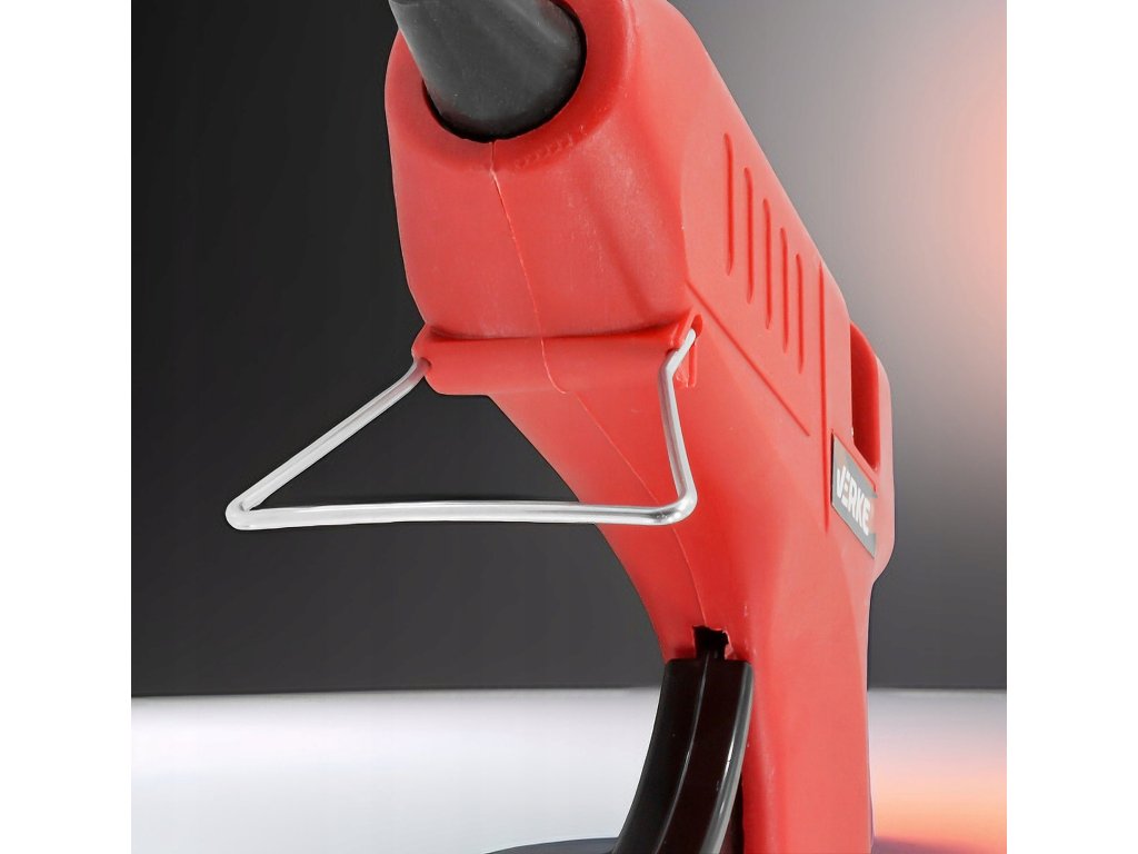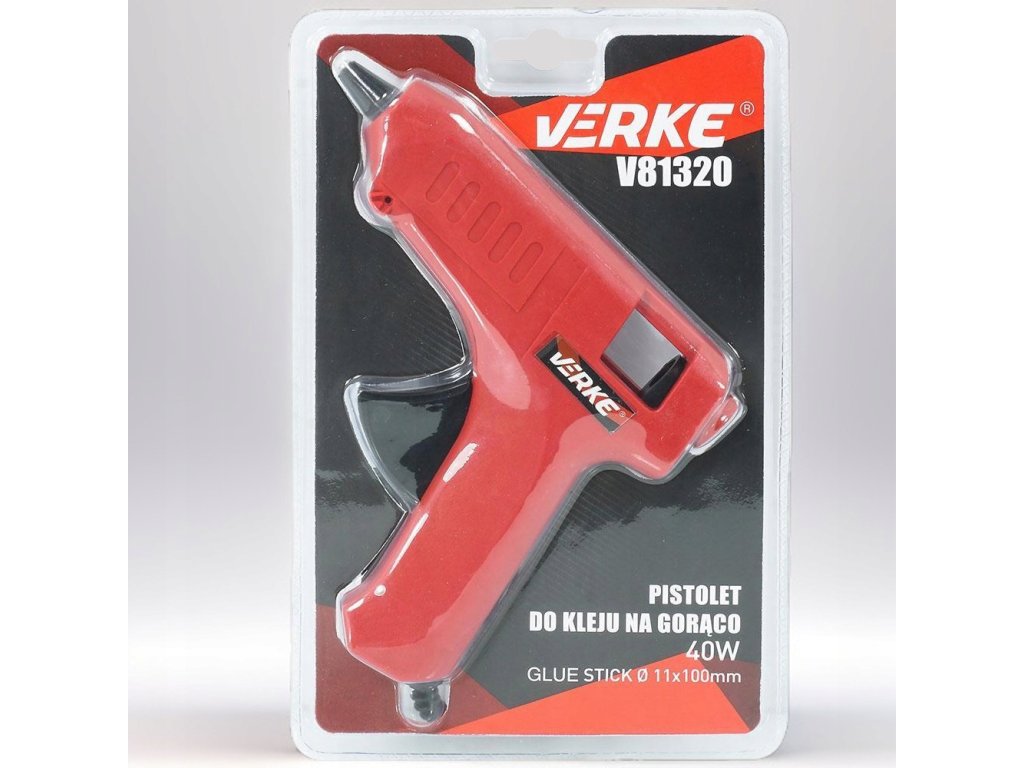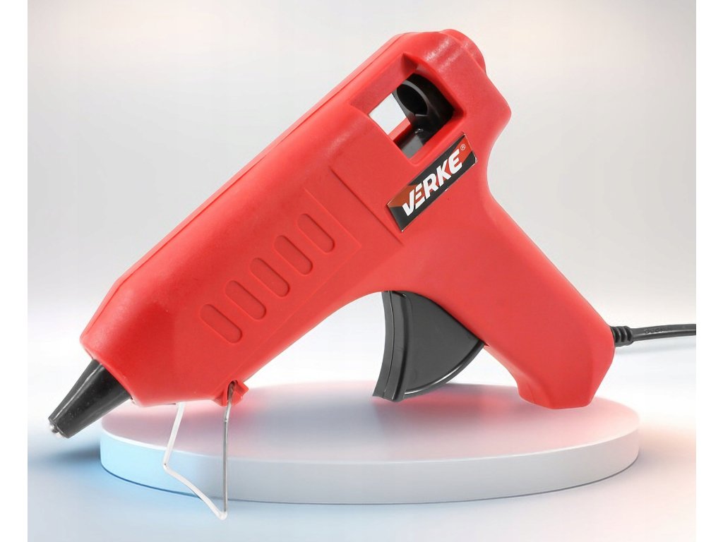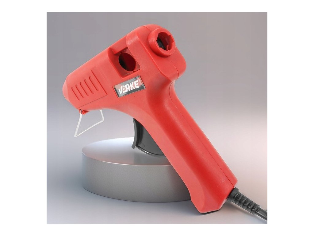 Lepiaca tavná pištoľ, Verke V81320Tavná lepiaca pištoľ je určená na lepenie rôznych druhov materiálov pomocou lepidla. Lepidlo je zahrievané pomocou vnútorného výhrevného telesa a potom je cez lepiacu trysku vytláčané von. Spojenie materiálov nastáva po ochladení lepidla naneseného na spájané povrchy. Sklopná spona umožňuje bezpečné odkladanie pištole.