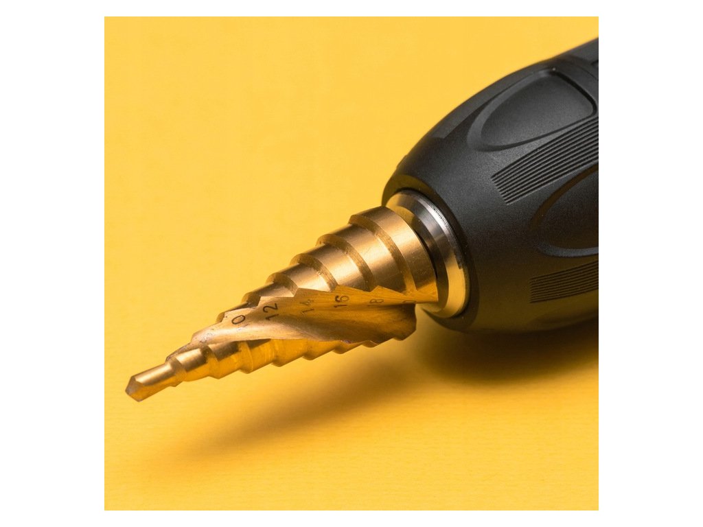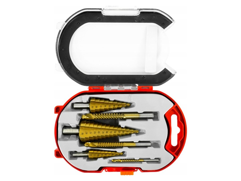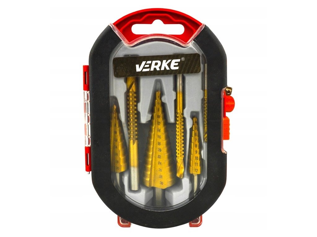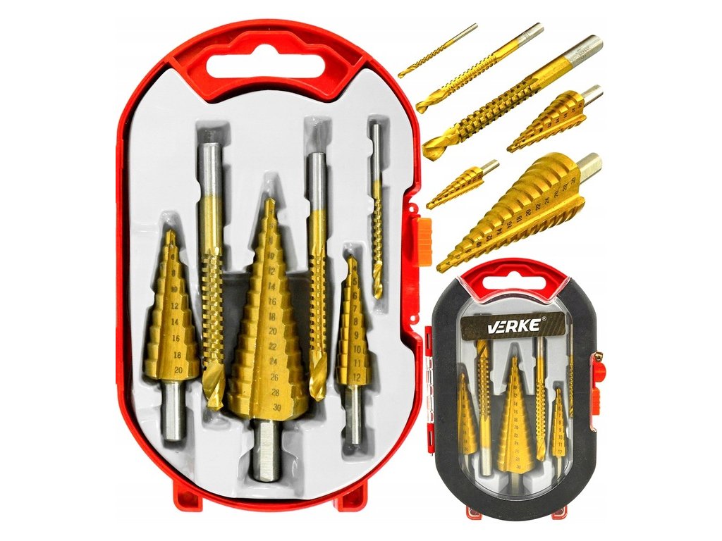 Univerzálne frézové vrtáky na kovy 3+3 ks., Verke V05051Stupňovité kužeľové špirálové vrtáky vyrobené z vysoko kvalitnej rýchloreznej ocele HSS4241 pokryté povlakom z nitridu titánu.